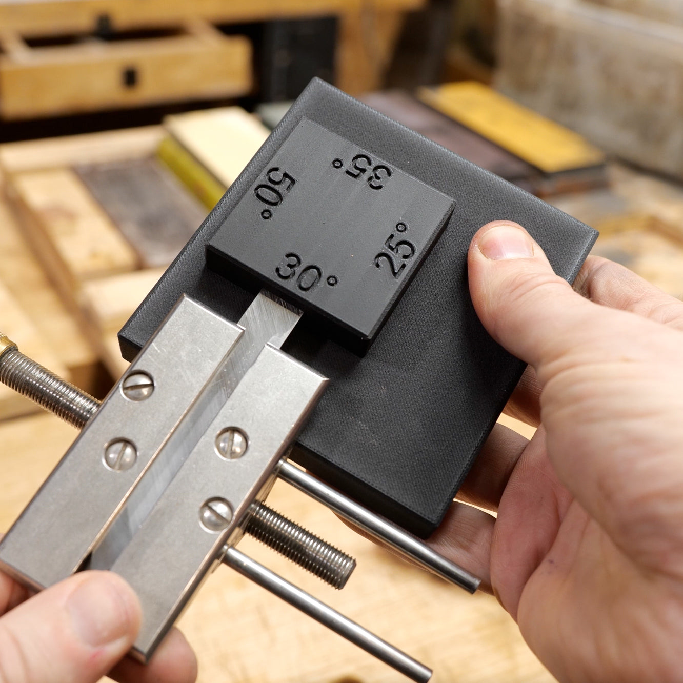 Creating protrusion stops can present a complex task. Our solution is a stop that places the honing guide in the perfect position every time.